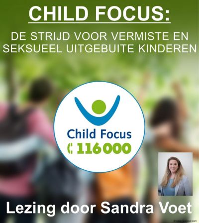 Spreekster van deze avond is mevr. Sandra Voet. Zij is dagelijks betrokken bij al deze complexe problemen waarmede Child focus wordt geconfronteerd. Zij behaalde een master in de rechten aan l’ Université Libre de Bruxelles. Daarnaast heeft ze een extra opleiding gevolg over bemiddeling. In 2004 trad ze in dienst bij Child Focus als Case Manager. In 2014 werd zij Coördinator Vrijwilligerswerk & Partnerschappen. Sinds september 2022 is zij terug actief binnen de afdeling Operaties & Steun als Coördinator First Responder. Vanaf 1 januari 2023 is zij directeur van de afdeling Operaties & Steun. Zij werkt in de eerste lijn en kent de problemen waarmede Child Focus wordt geconfronteerd als geen ander.