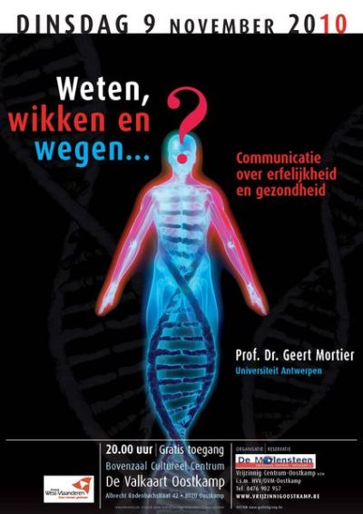 De genetica is onze leefwereld binnen gedrongen zodat we nauwelijks nog om de communicatie over erfelijkheid en gezondheidszorg heen kunnen. Dank zij de toepassingen van de genetica in de gezondheidszorg kunnen we gezondheidswinst boeken. Hoe het ook zij, we hoeven in ieder geval steeds minder weerloos toe te zien als erfelijkheid in het geding is. Ons neerleggen bij ons biologisch lot hoeft niet langer, er valt immers iets te kiezen. Daarvoor is het belangrijk dat we ons goed laten informeren en weloverwogen beslissingen nemen, want de consequenties kunnen ingrijpend zijn. Wat dacht je van een preventieve borstamputatie als je drager bent van het gen voor borstkanker. Erfelijkheidsonderzoek en -advisering kunnen ons helpen een geïnformeerde keuze te maken uit de beschikbare opties. Het komt dus neer op weten, wikken en wegen en op handelen met voorkennis. Maar bij het maken van een keuze spelen waarden en normen een belangrijke rol. Hoeveel zicht hebben we daarop en welke rol spelen ze bij de behoefte aan en interpretatie van informatie? Hoe staan we zelf in het leven, met andere woorden wat is onze levensbeschouwing en hoe bepaalt dat onze kijk op nieuwe mogelijkheden. Het kunnen kiezen hoort bij vrijheid. Maar hoe vrij zijn onze keuzes eigenlijk?